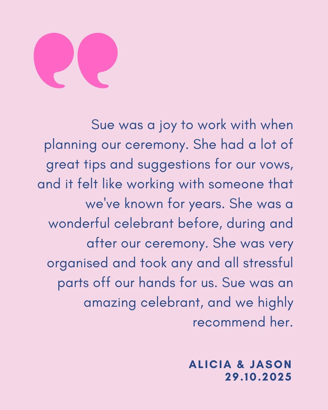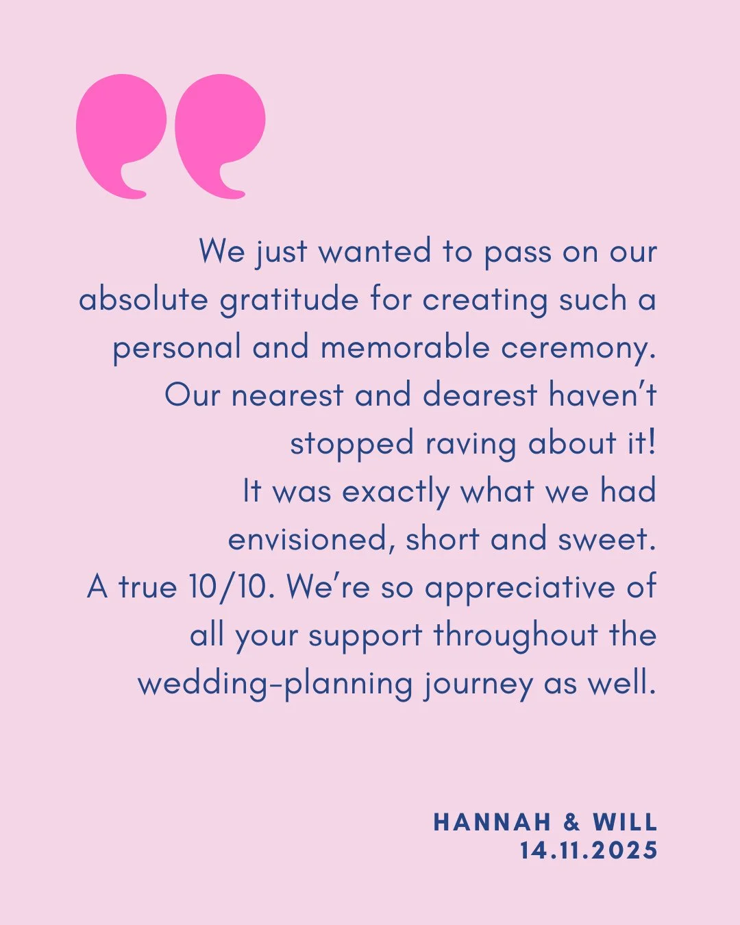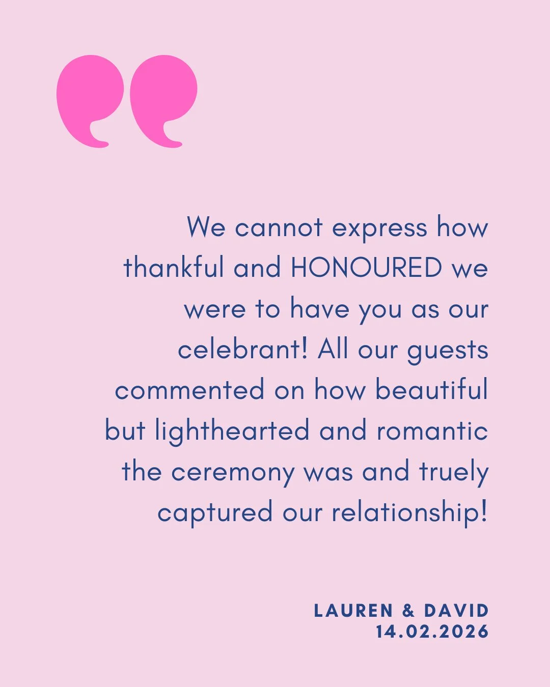 Creating your story and then delivering it to your guests gives me such a high! I don’t do boring, I do fun! I work with you to get your guests engaged and loving the ceremony as much as you and then they’re all vibed up and ready to celebrate. It’s a win-win! So, if it’s something light-hearted you’re looking for, not too long and you enjoy a good laugh, get in touch.