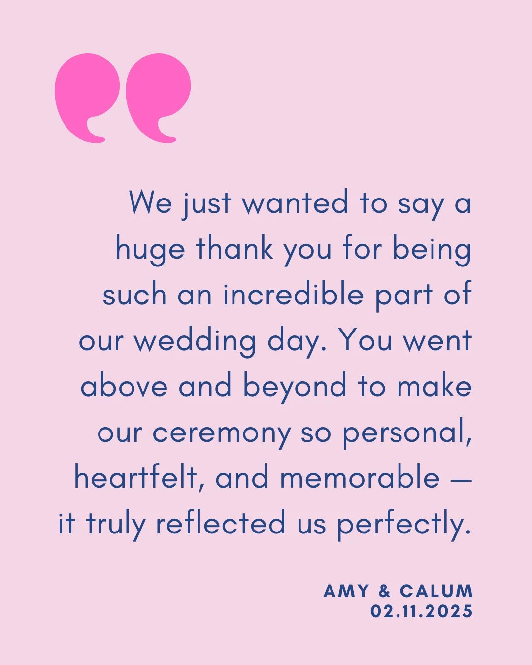 Creating your story and then delivering it to your guests gives me such a high! I don’t do boring, I do fun! I work with you to get your guests engaged and loving the ceremony as much as you and then they’re all vibed up and ready to celebrate. It’s a win-win! So, if it’s something light-hearted you’re looking for, not too long and you enjoy a good laugh, get in touch.